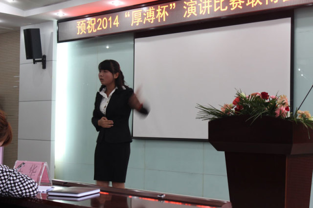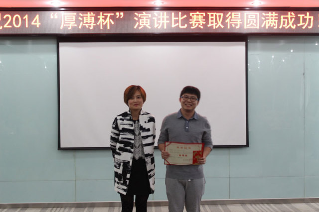 2014年10月31日,“厚溥杯”演講比賽決賽如期在光谷軟件園C6棟109多功能會(huì)議廳舉行。評(píng)委會(huì)由武漢景寧人力資源服務(wù)有限公司、武漢厚溥教育科技有限公司專家及各高校教務(wù)相關(guān)領(lǐng)導(dǎo)組成,通過(guò)嚴(yán)密的賽制,最終決出特等獎(jiǎng)1名、一等獎(jiǎng)3名、二等獎(jiǎng)5名、優(yōu)秀獎(jiǎng)8名,而優(yōu)秀指導(dǎo)老師則被湖北三峽職業(yè)技術(shù)學(xué)院劉靚老師獲得。